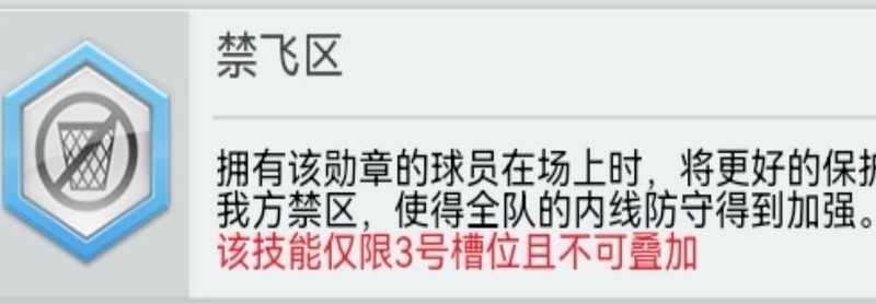 限定位置使用,仅限三枚。佩戴时提升场上五人内线防守能力,对团队有增益效果,普遍由首发和替补球员装备。