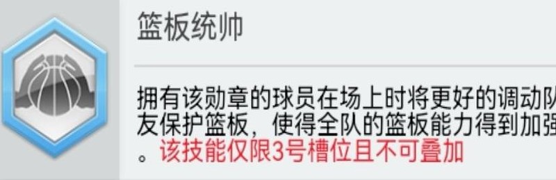 限定位置徽章,仅限三枚。团队增益效果,球员在场时提升全队五人篮板能力,普遍由首发和替补球员佩戴使用。