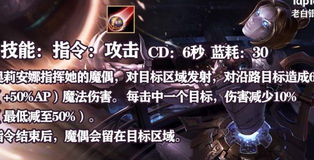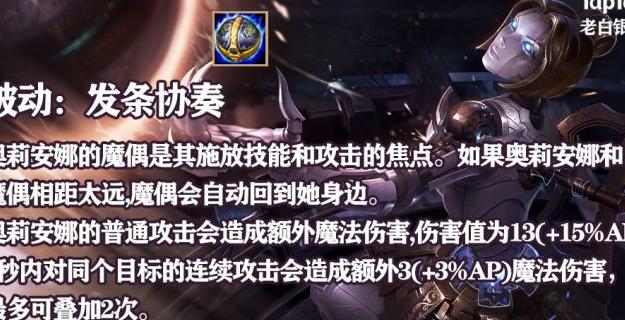 奥利安娜的普通攻击附带随等级和法术强度提升的额外魔法伤害,同一目标连续受击时,该伤害逐步叠加增强。