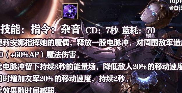 奥利安娜的二技能拥有高额范围伤害,可对敌人造成减速,同时为友军提供加速效果,常与一技能配合使用。但由于该技能蓝耗较高,对线期需密切关注蓝量,合理选择释放一技能单用或采用一二技能连招,以确保持续作战能力。