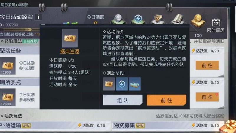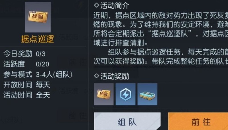 据点巡逻是日常任务之一,完成可获得20点活跃度。此外,还能获取经验、银币、技能点及加固板等奖励。每次成功完成挑战即可结算一次奖励,最多可结算三次。若未完成全部三次挑战,将无法领取活跃度及相关物资奖励。已完成三次奖励结算的玩家仍可继续挑战,但不再获得任何奖励。