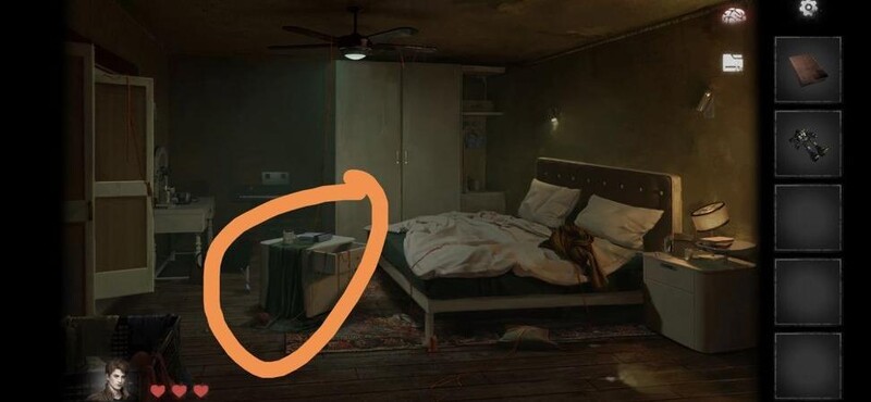 点击右侧床头柜,输入密码8464,打开抽屉取出剪刀和纸条。