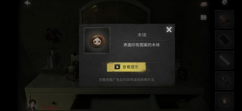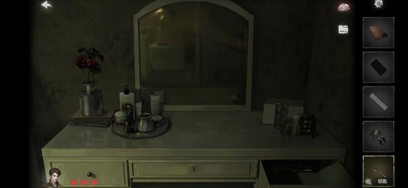 用钥匙开启梳妆台中间抽屉,取得木块与纸条。