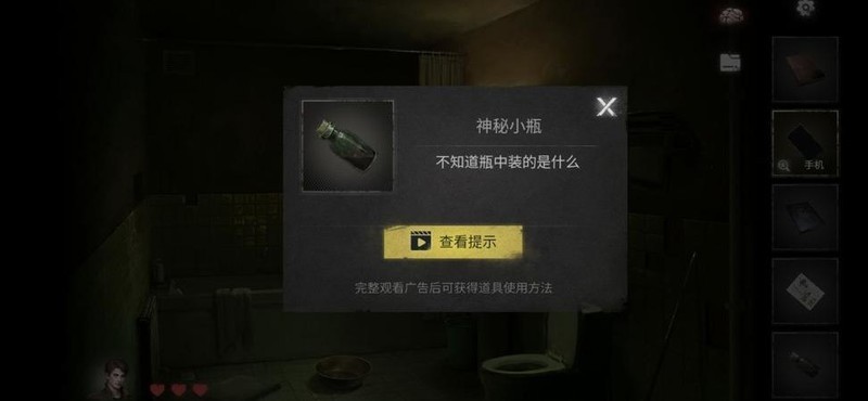 进入厕所,将蜡笔画放入盆中,用神秘小瓶点击,触发剧情后第三章结束。