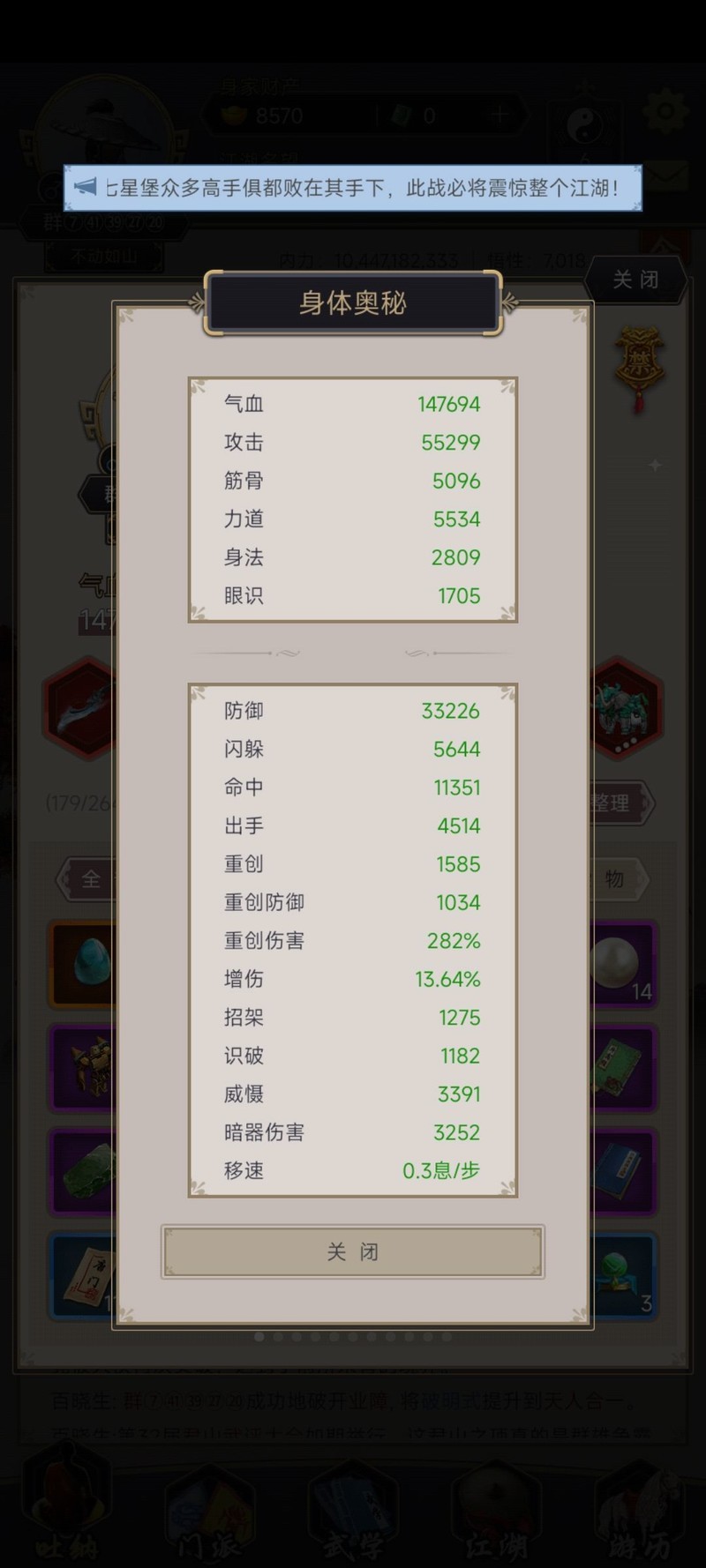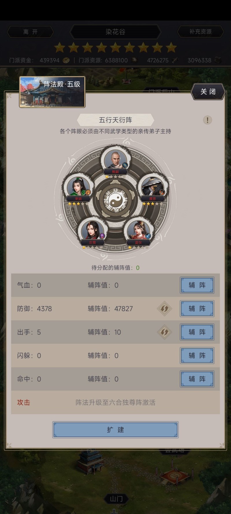阵法等级五,配备四名寒冰弟子,属性四二十一加一十九,刀法与拳法传承已满,刀天赋含紫色重防与红色免伤,腿法技能为地龙追影天机。