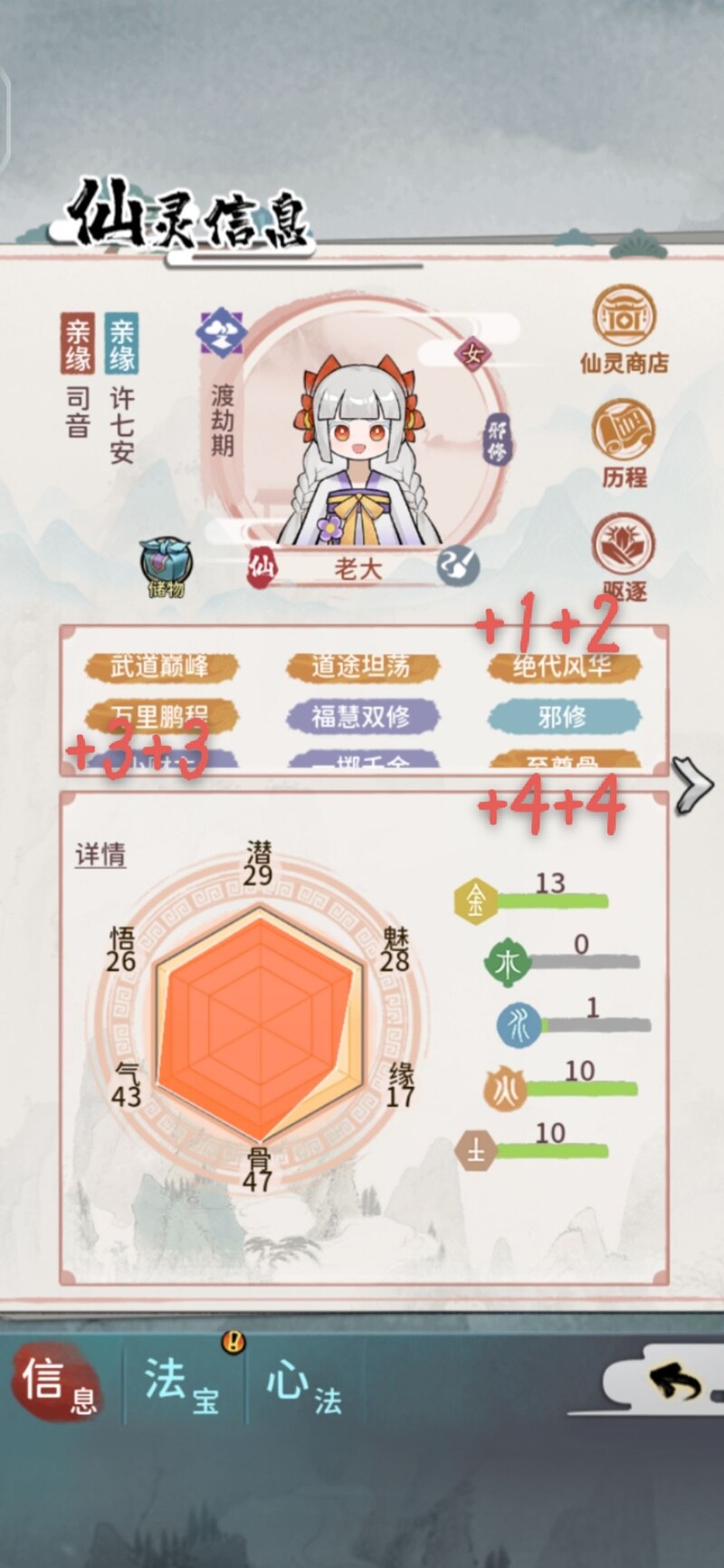 下一年将面对心魔劫难。斩龙之后切勿急于行动,在挑战心魔前务必检查装备与心法配置。建议首把使用穿透类剑或枪,枪可降低敌人防御或血量;第二把搭配回血刀,第三把最好配有减伤傀儡。若无合适武器,可不强求,但心法必须选用最佳,且渡劫心法需满足24点悟性要求。队友应选修为最高者,优先带回复能力的回血刀。