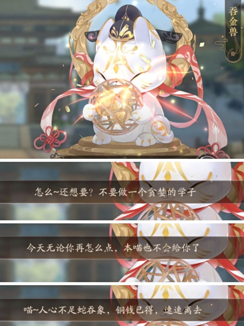 招财猫每日可点五次祈福领金币,多点会被骂,每次得几百上千零钱。