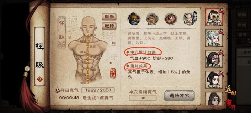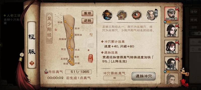 这样点会遇到真气上限不足的问题,可能导致经脉只能点到七层便无法继续。无需担心,可先为其他随从提升经脉,准备三名工具人角色,优先打通他们提升真气上限的经脉,积满真气后轮换队伍,逐步完成所有经脉的修炼。