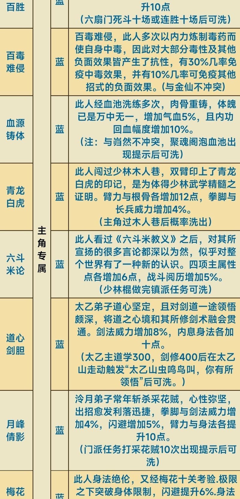洗毕业天赋时需注意:在剑术无双、拳脚无双、刀法绝伦、棍法绝伦等紫色专属天赋中,唯有棍法绝伦具备较高使用价值,其余天赋效果一般,不建议优先洗练。