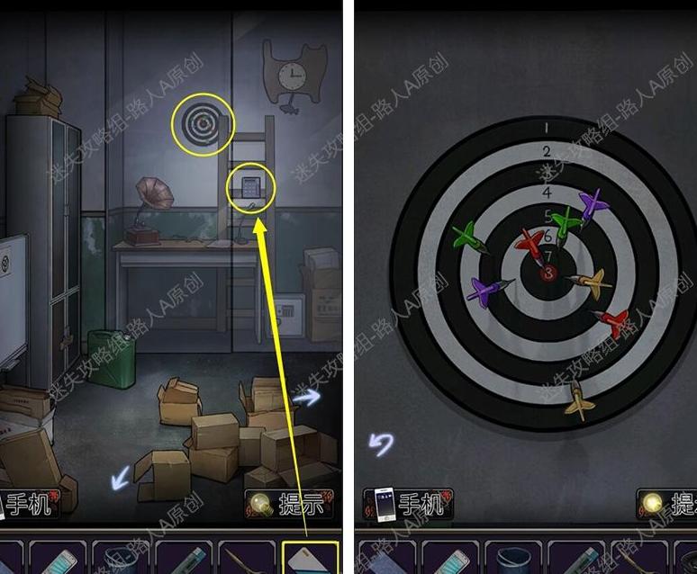 前往厕所门口,依照隐藏教室飞镖盘的提示,调整墙上机关,成功取得。