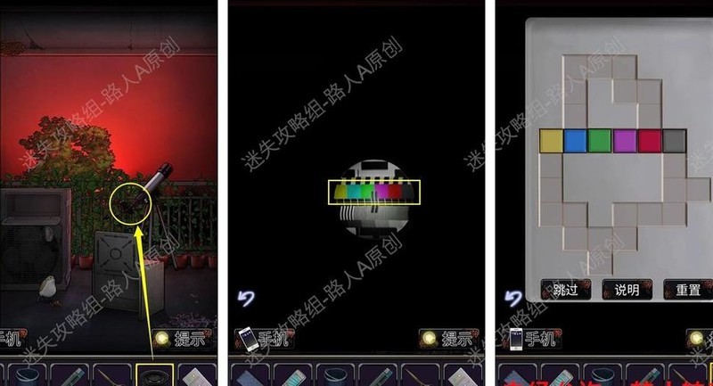 登上露台,把镜头装在望远镜上,通过观察获取线索,破解磁带盒机关,最终取得磁带。