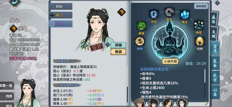 屈心的抗性削弱效果可达90点,配合自身优秀的根骨属性,在遁甲招募时通常会与主角一同出场。两人本体加召唤物能迅速对敌方施加逃跑状态,压制力极强。而紫薇刀提供的减伤效果,还能让我的同伴多承受一次攻击,为主角争取到关键的输出时机。