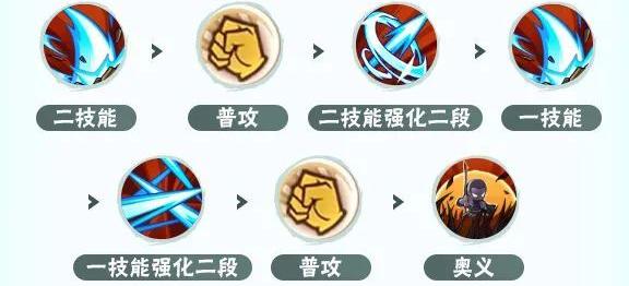 起手二技能后撤避免远程消耗,衔接普攻等待光圈出现,触发强化二段输出。接着使用一技能突进贴身,配合特殊普攻持续压制,填补技能强化前的空档。待三船技能图标显现光圈,立即释放一技能强化二段造成高额伤害,最后果断开启奥义完成收割。