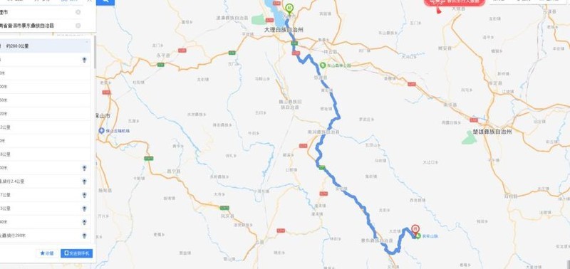 由于未曾亲历,通过百度地图测量,从无量山脉到哀牢山脉的距离约150多公里,若骑自行车前行,通常需要一整天时间。为便于参考,这段路线以两处山脉为代表点进行测算,实际途经地点较多。顺便提及,从大理出发抵达该区域又有多远?接下来仍借助百度地图进一步查看具体里程信息。