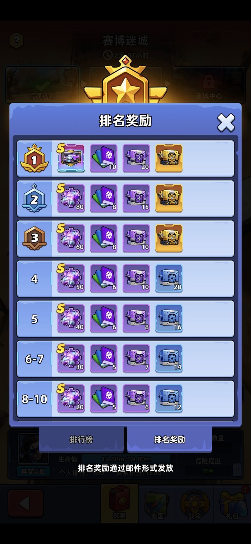 赛博迷城是游戏内限时活动之一,也是目前少数能获取S级战车的途径。在排行榜奖励中,不仅有S级整车,还有S级战车碎片。排名第一的玩家可直接获得当期S级战车,即使已拥有该战车,重复获得将会转化为100个碎片,用于提升星级。未能登顶的玩家也无需灰心,通过收集足够的碎片,同样能够合成完整的S级战车。