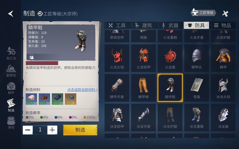 大师晋升宗师时,可选用鳞甲套装进行强化,我仍选择优先升级鞋子,制作鳞甲鞋以提升实力。