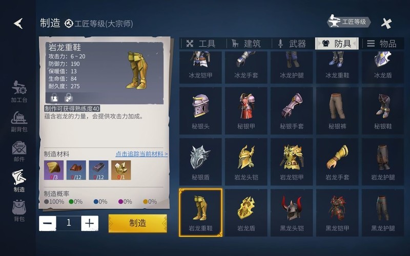 前往匠神处后,建议装备烈焰裁决与岩龙鞋。若要打造整套岩龙装备,需合理使用岩龙鳞片,避免浪费,除非鳞片资源十分充足。提升工匠等级是关键步骤。