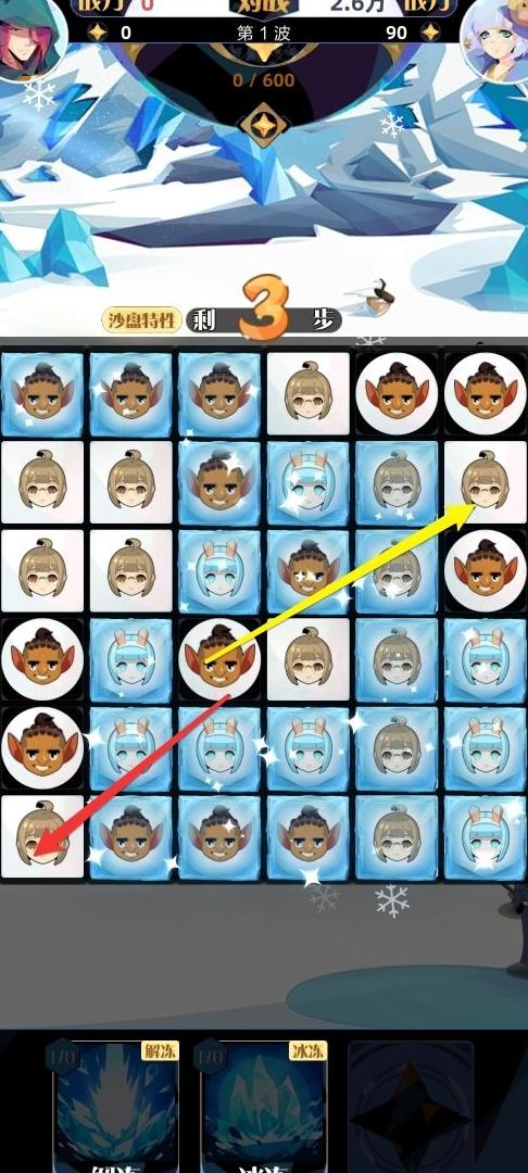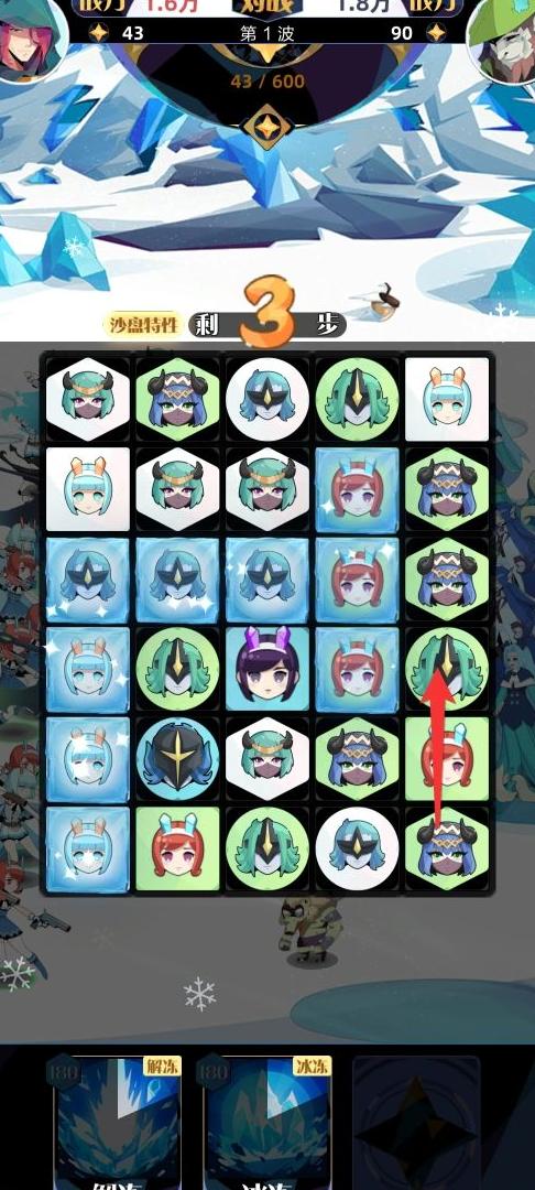 随着多次消除,绿色形态会逐渐增多。移动时需将两个绿色方块对齐在同一行或列,间隔不超过三个方块。例如将绿色月斩与上方的绿色卡洛交换,使冰冻格子连成完整一行,即可触发整排冰冻格子的清除效果,实现高效消除。
