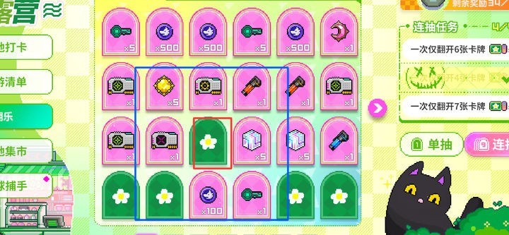 翻翻乐任务分为单抽和连抽两种方式。单抽就是任意点击一个位置的卡片进行翻开,而连抽则是以选中的卡片为中心,将其周围九宫格范围内的所有卡片一次性翻开。例如第一张图中,选择连抽并点击红圈位置,就会一次性翻开蓝圈范围内的九张卡片。第二张图中,已有三张卡片翻开,此时点击红圈位置,周围只能再翻开三张。第三张图中,已翻开七张卡片,点击红圈后仅能再翻开两张。第四张图中如果想完成一次翻开七张卡片的任务,可以先进入一个全新的翻牌页面,先选择单抽方式,点击黑色圈中的两张卡片单独翻开,再切换到连抽方式,以红圈为中心点击,这样就能翻开蓝圈范围内剩下的七张卡片,完成任务。我之前没有完成任务是因为每次进入都忘了切换到连抽模式,误用了单抽方式,导致操作混乱。以上是我的理解,如有错误欢迎指正。