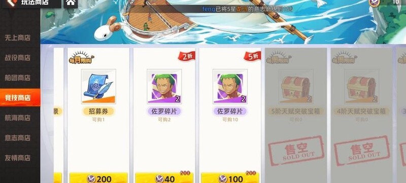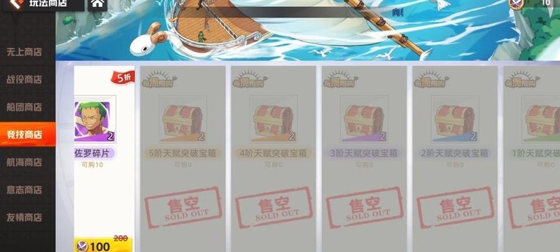 竞技商店可兑换索隆碎片,若无法抽到鹰眼,建议购买补充。