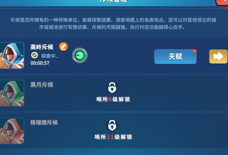 哨所等级提升后,可解锁更多功能。此处用于管理斥候,派遣其侦查并探索野外迷雾区域。等级越高,可招募的斥候数量越多,获得的天赋点也越多,可用于解锁各类技能,增强侦察能力。
