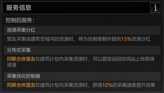 最有趣的是成功控制空间站后所带来的各种权益。控制方可以启动空间站计划,联合体成员均可在该计划中执行舰队采集和调动等操作。参与计划的成员在采集时不仅能享受加速效果和分布式采集优势,还能在空间站上传资源。此外,控制者还能从计划内采集的所有资源中获得额外的资源分红。