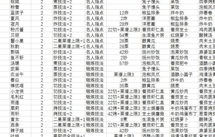 倒数第四列显示的是将三道菜谱提升至神级所欠缺的技法值,这些通常需依赖厨具补充。但仔细分析会发现,某些厨师缺失的技法值完全可通过修炼弥补,无需更换现有厨具。这意味着提前培养特定厨师,能为后续进阶提供便利。因此,我们的修炼策略应以此为基础展开,合理规划前期投入,实现后期高效提升。