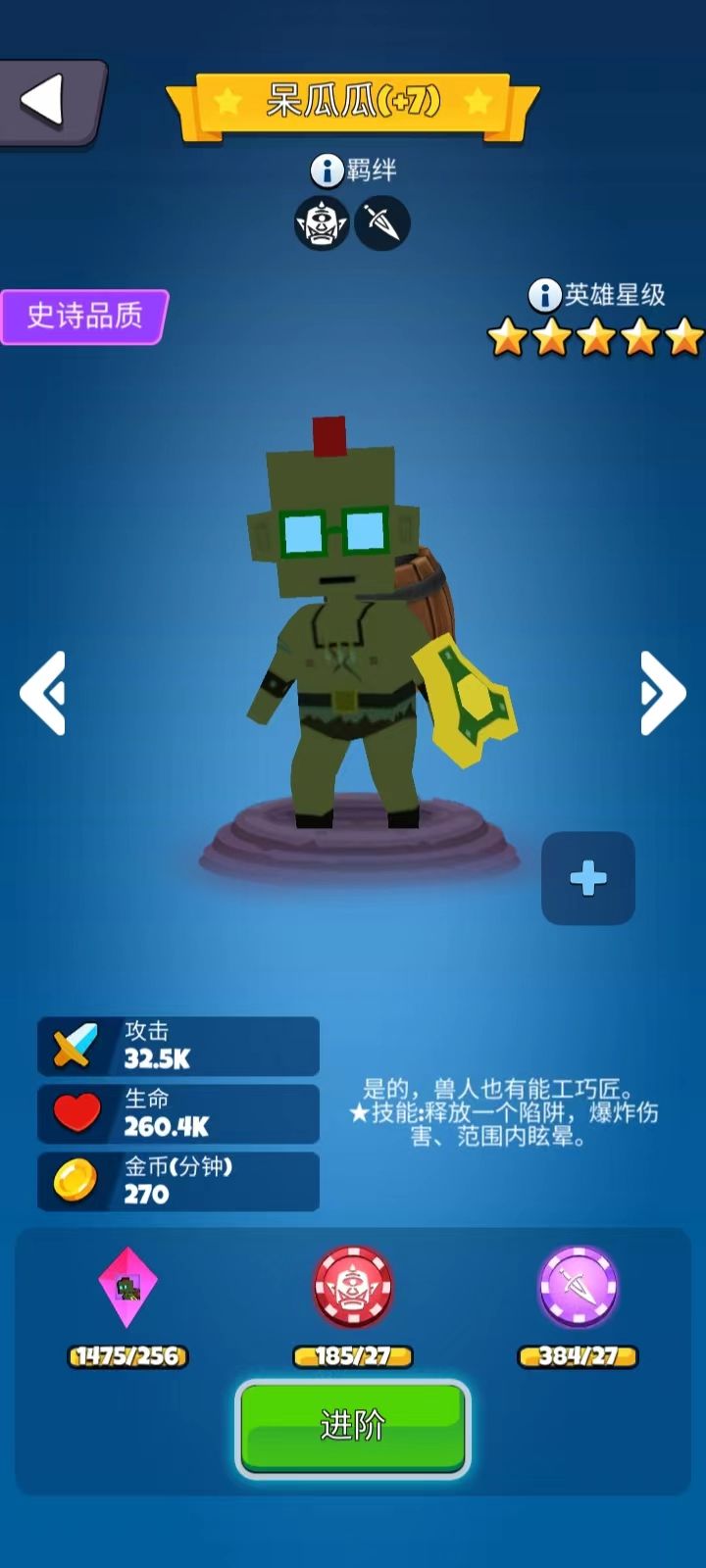 呆瓜瓜这名英雄拥有全游戏最强的控制技能,附带减益效果,但生存能力较弱,定位为辅助角色。