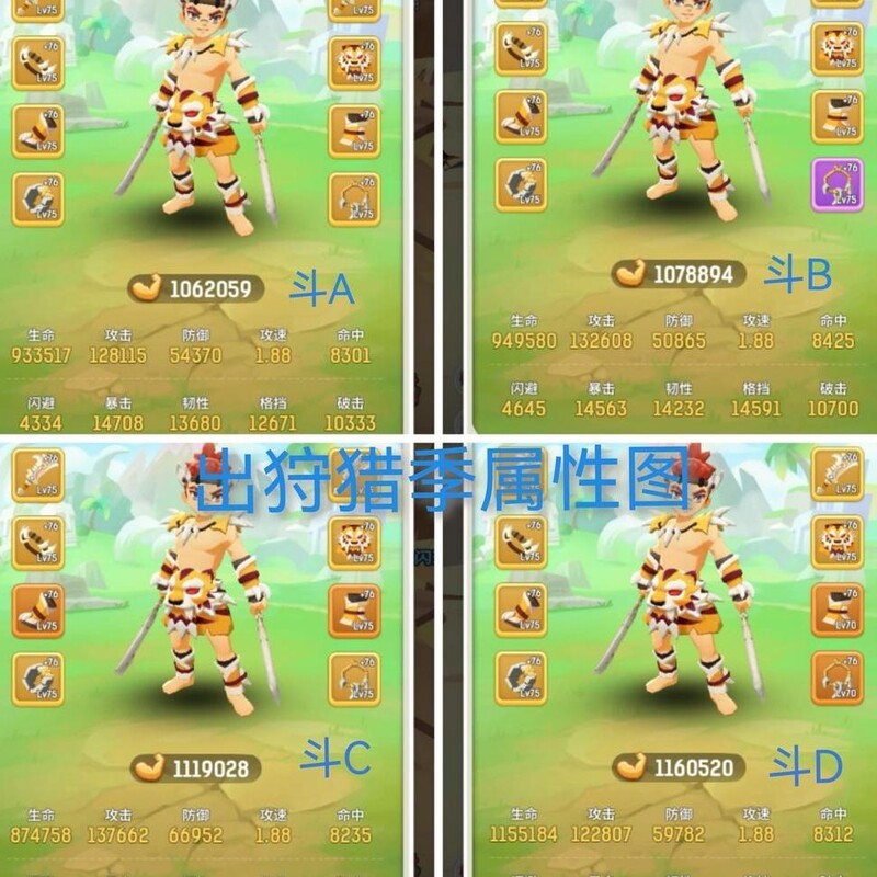 先展示下我的四个账号在6月3日狩猎季结束前的最终属性,技能等级分别为20、18、10、10。氪金情况为:斗ABD花费450,斗C花费778(其中328是临时追加,因四五名竞争激烈,为保住前四而额外投入),总计投入2128元。