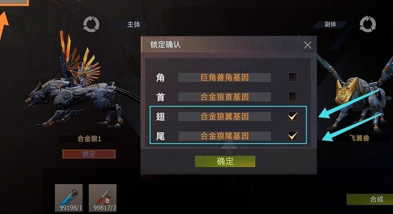 将合金狼1与飞翼兽放入基因合成系统,锁定合金狼翼和尾部基因,启动合成程序。
