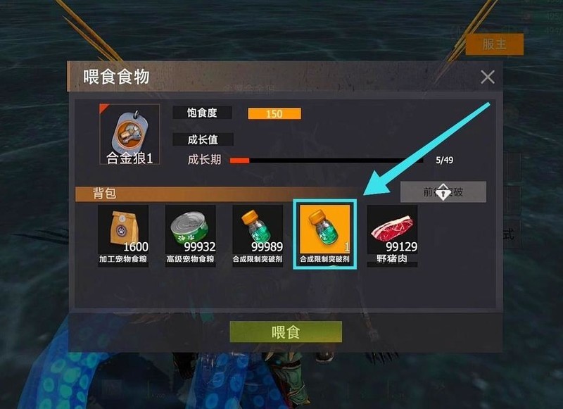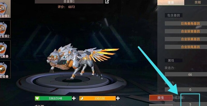 召唤合金狼1,喂食1个合成突破试剂,使其合成次数恢复至5次。