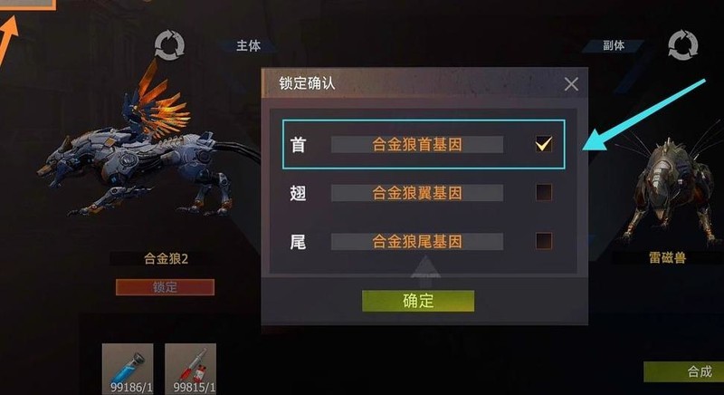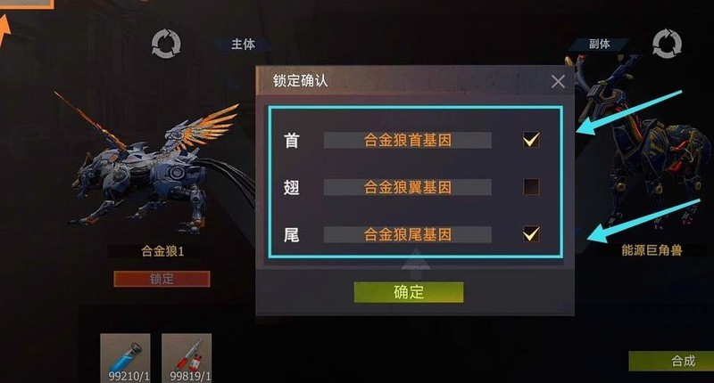 将合金狼1与巨角兽放入基因合成器,锁定合金狼头部和尾部基因,启动合成程序。