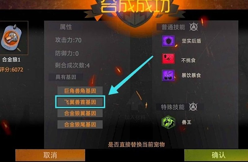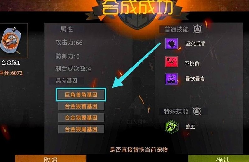 合成完成后,合金狼1成功获得巨角兽角基因。