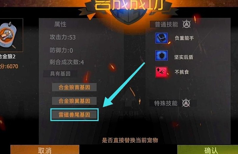 合成完成后,合金狼2将具备雷磁兽尾的基因。