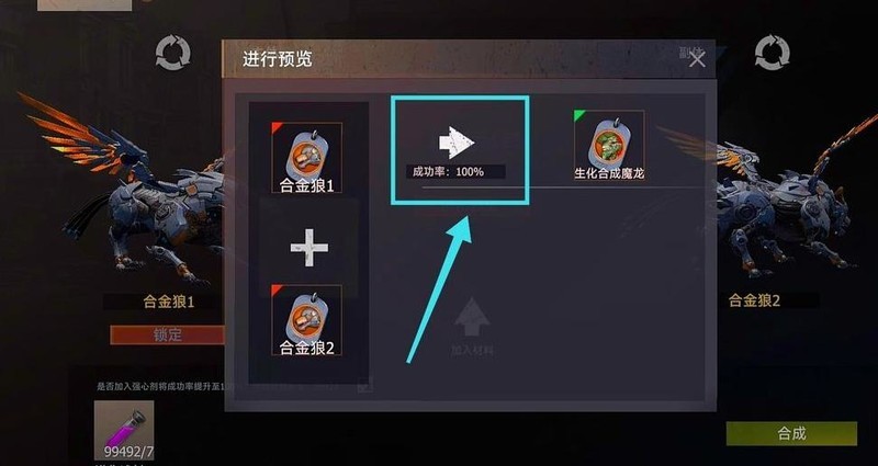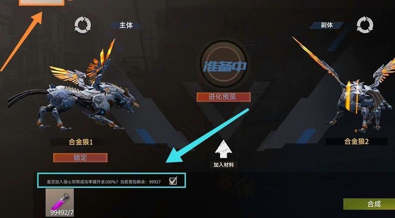 将合金狼1置于基因培养装置主体,合金狼2放入副体,勾选左下角进化强心剂,预览合成效果后点击开始进化。