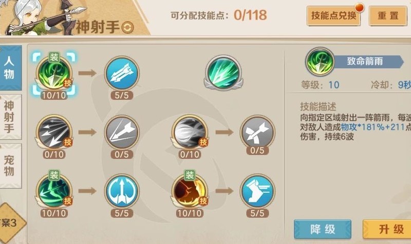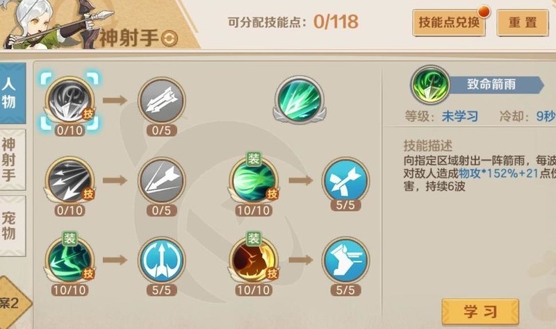 第二套技能组合:穿云射日或致命箭雨,搭配后发制人、迅捷步伐与万箭齐发,适合后手爆发输出,操作流畅且威力强劲,个人更推荐此配置。