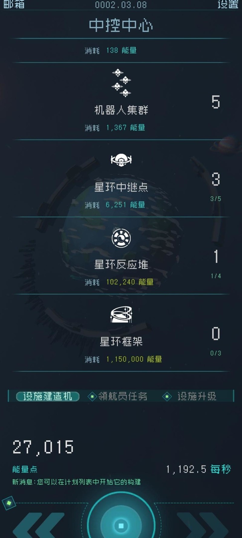 进入主界面后点击右下角蓝色箭头进入建筑页面,建造星环的完成标准可参考对应示意图。