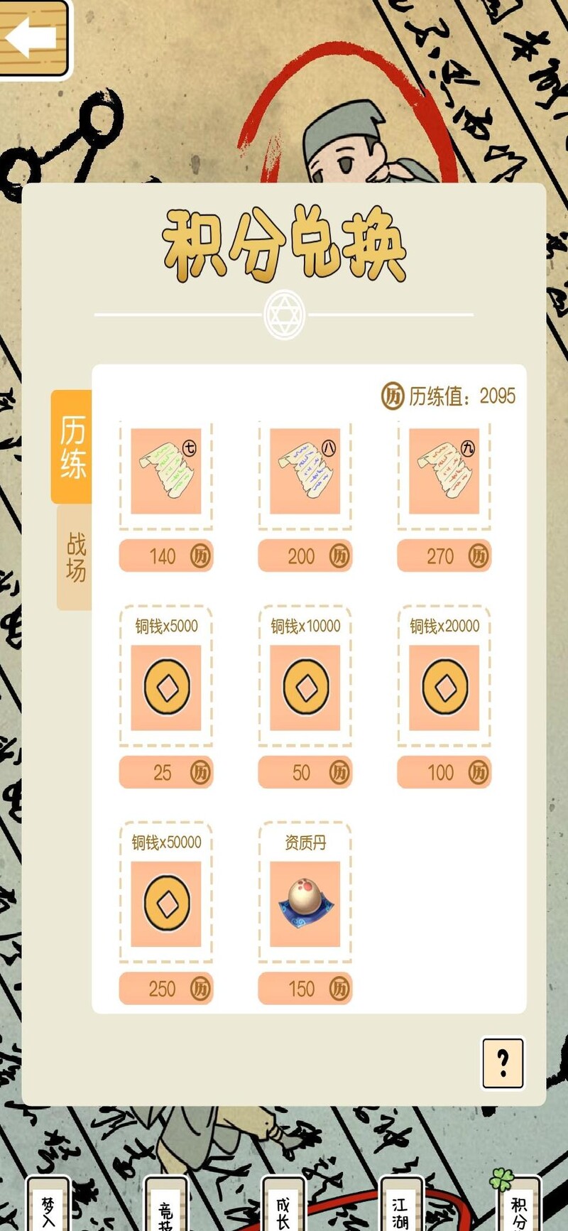 4. 历练积分可用来兑换奖励。游戏中可通过竞技场、装备排行、世家竞技、古墓探险等途径获取历练值。积攒后可在兑换界面选择金币或武学,对零氪或轻度充值玩家,建议优先兑换金币,武学主要依赖挂机收益获取。每日竞技场设有幸运数字,匹配到幸运数字时参与更划算,不必一味追求排名提升。
