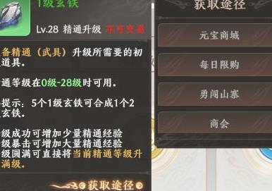 武具精通升级需用玄铁,防具精通则需精金材料。