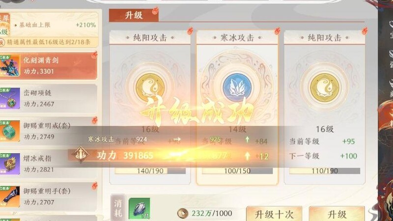 每次升级时有几率触发暴击,获得四倍经验,或触发圆满,直接升至满级。