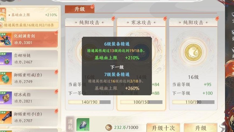 满足装备精通条件后可提升灵犀精通等级,等级越高,属性上限提升越多。