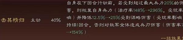 若在下一回合行动前受到超过最大兵力20%的伤害,将恢复自身兵力(治疗效果为296%,受统率属性影响),并降低25%所受谋略伤害(受统率影响),持续1回合;反之,则对敌方全体发动兵刃攻击,伤害率为154%。该战法兼具自我保护与强力输出能力,攻守兼备。