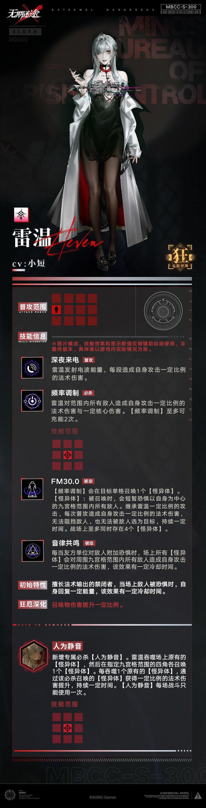 无期迷途雷温初评:恐惧队核心成员,与恩菲组队表现出色,九宫格大招控制力强,召唤物机制独特且辅助能力出色。虽需暖机,但在恐惧队体系中潜力可观。老玩家可优先考虑入手,普通玩家建议观望。