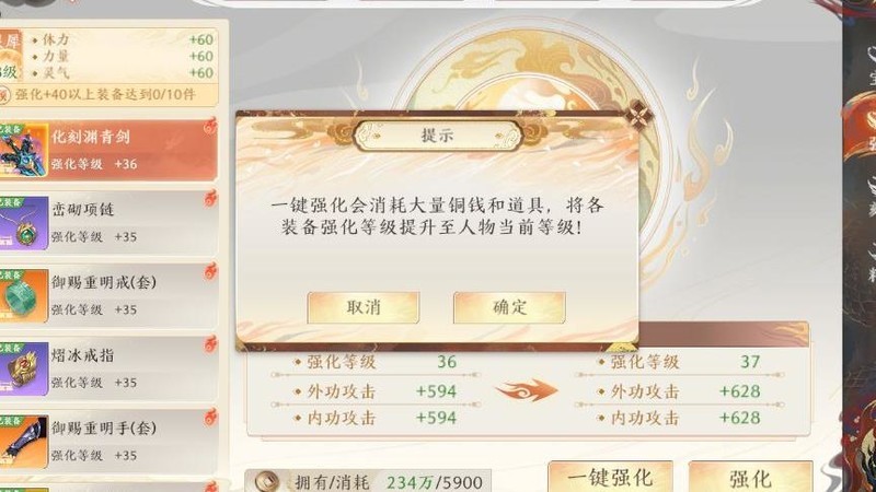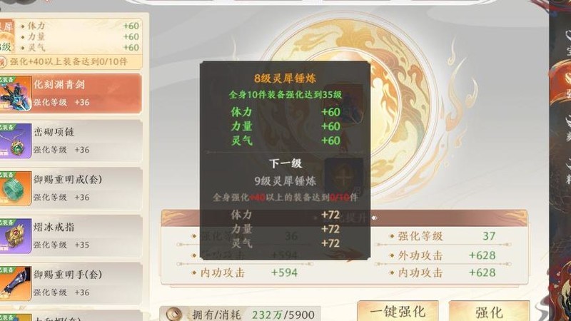 强化需消耗相应等级的精华与铜钱。