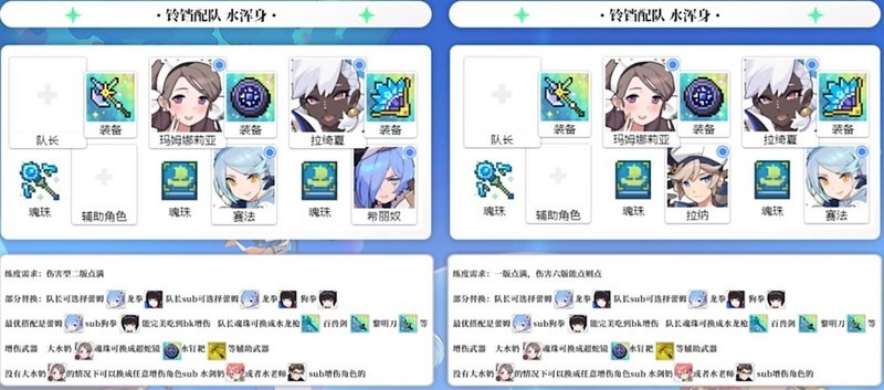 相比速攻队伍,铃铛队伍更应重视生存能力(当然,拥有强力水系治疗的队伍生存能力本身就很强)。鉴于当前水属性其他体系仍显弱势,铃铛队伍仍更推荐采用水技伤体系的搭配。
