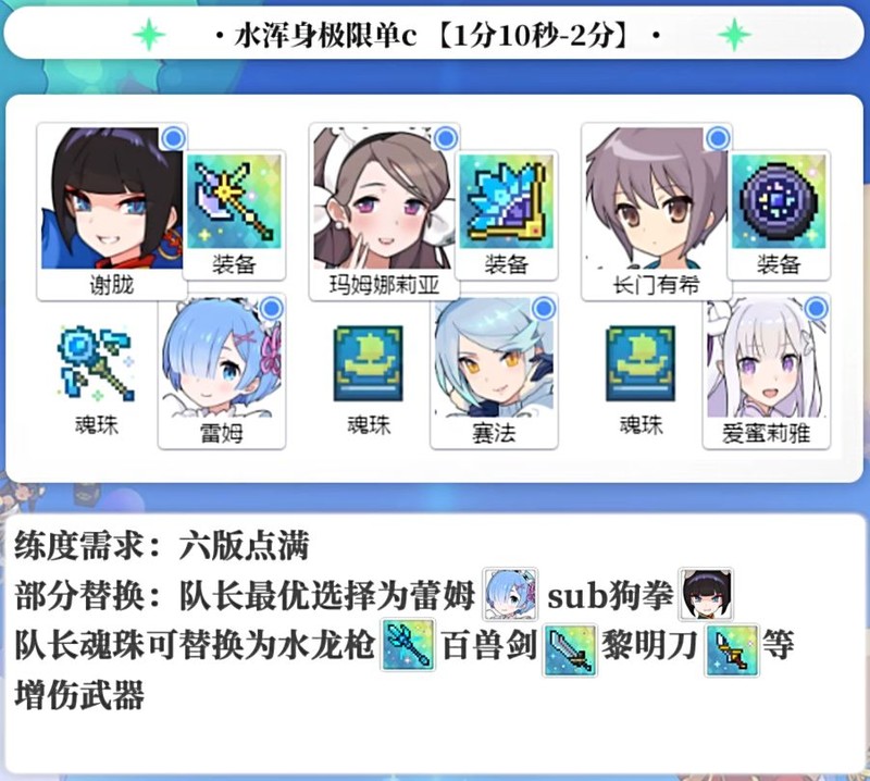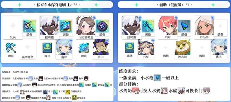 目前水队队长位置的主将和助战搭配方式多样,其中蕾姆搭配狗拳是此次副本的最佳选择,能够完美利用BK的增伤效果。但需要注意,若使用蕾姆+狗拳组合,应将大水奶的魂珠更换为水兵书,以避免技能释放顺序混乱。