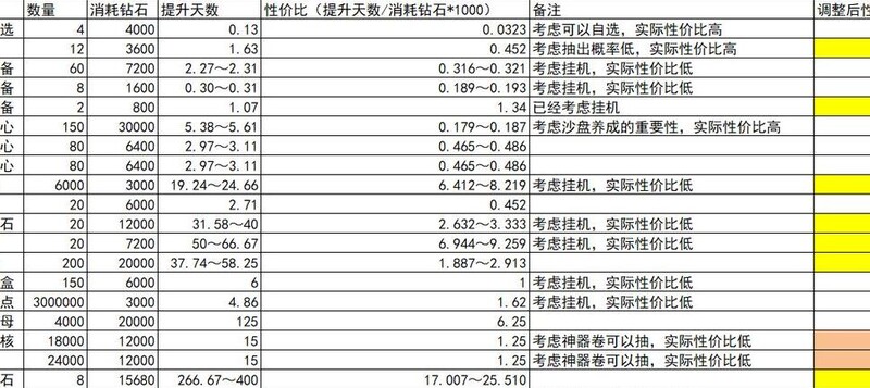 接下来分析蓝钻商店各商品的时间价值与性价比,结合备注信息进行相应调整,并对数据进行取整、求平均等处理,最终得出各类商品的综合性价比结果。