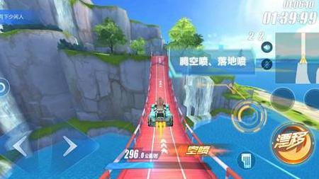 通过两个直角弯道后,将迎来一段笔直但起伏不平的赛道。这段路线中央横跨一座吊桥,赛车经过时会因地形变化连续两次腾空并触发空喷与落地喷。由于车辆在空中速度远超地面,车手可利用落地瞬间的高速进行轻点漂移,从而高效积攒大量氮气,为后续加速创造优势。掌握这一技巧对提升整体成绩至关重要。
