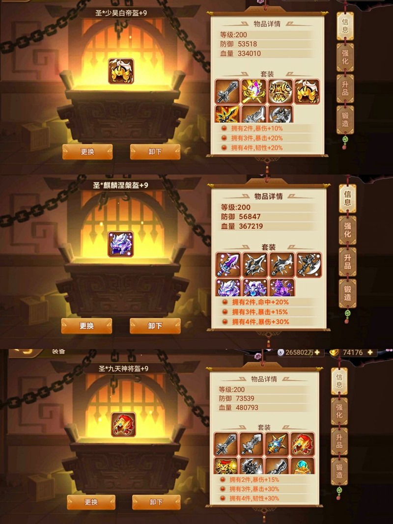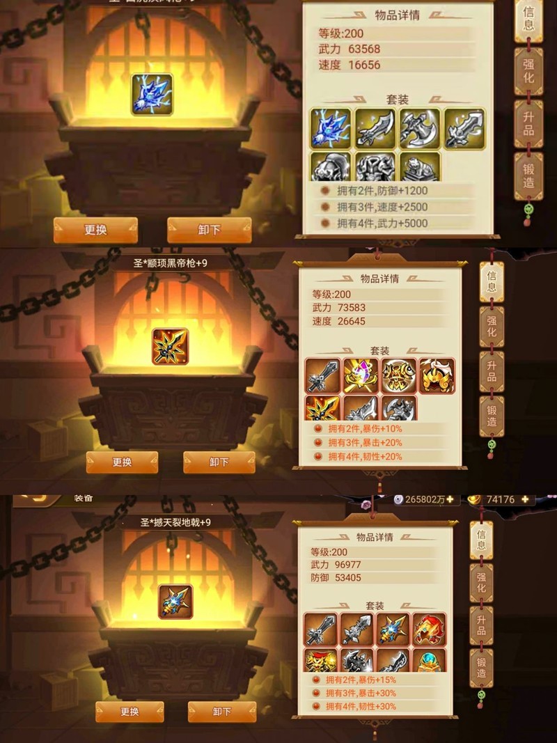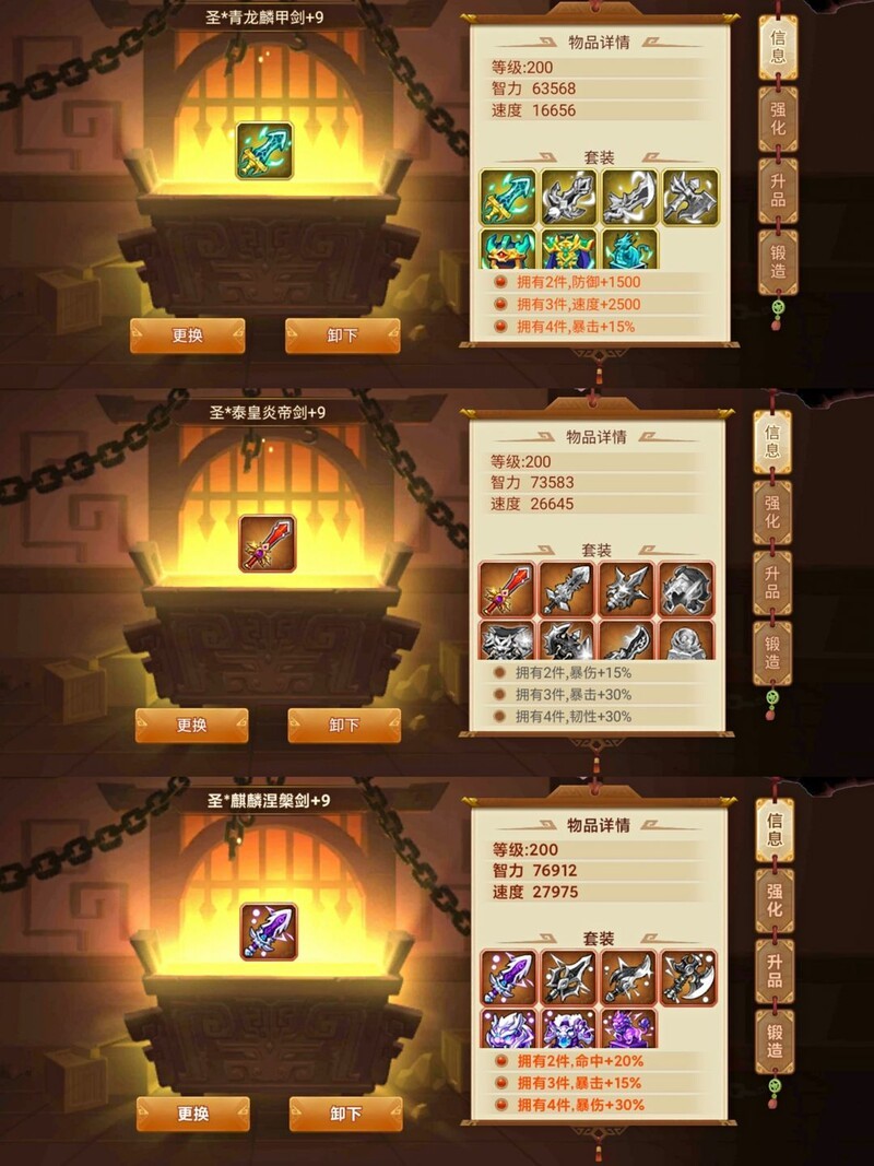 上述三类套装最高可升至+9,但+5之后升级成功率显著降低,且消耗资源巨大。新人玩家和中级玩家只需将装备提升至+5即可,无需急于追求+9,避免浪费资源。待日后资源充裕时,再逐步将关键装备升至满级更为合理,优先保障核心战力提升。