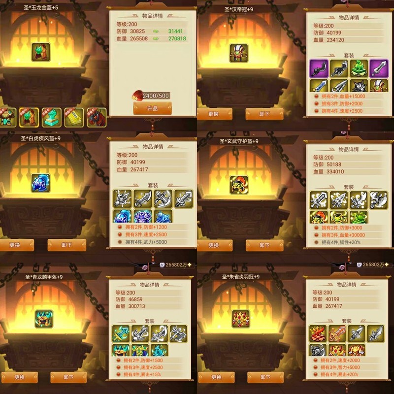 头盔属性差异较小,若偏好朱雀三件套加智力的搭配,可选择三件朱雀配一件玉龙衣,整体效果依然出色。